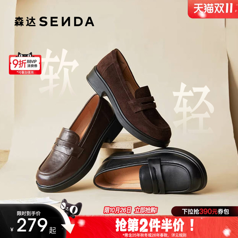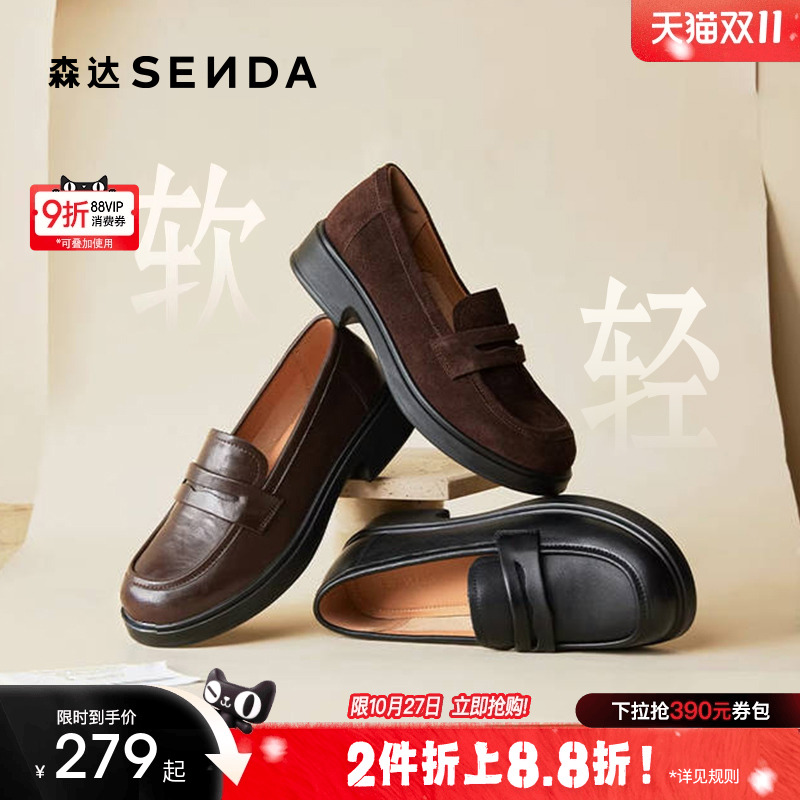 森达真皮秋季新款乐福鞋女商场同款英伦风小皮鞋通勤黑色厚底女鞋