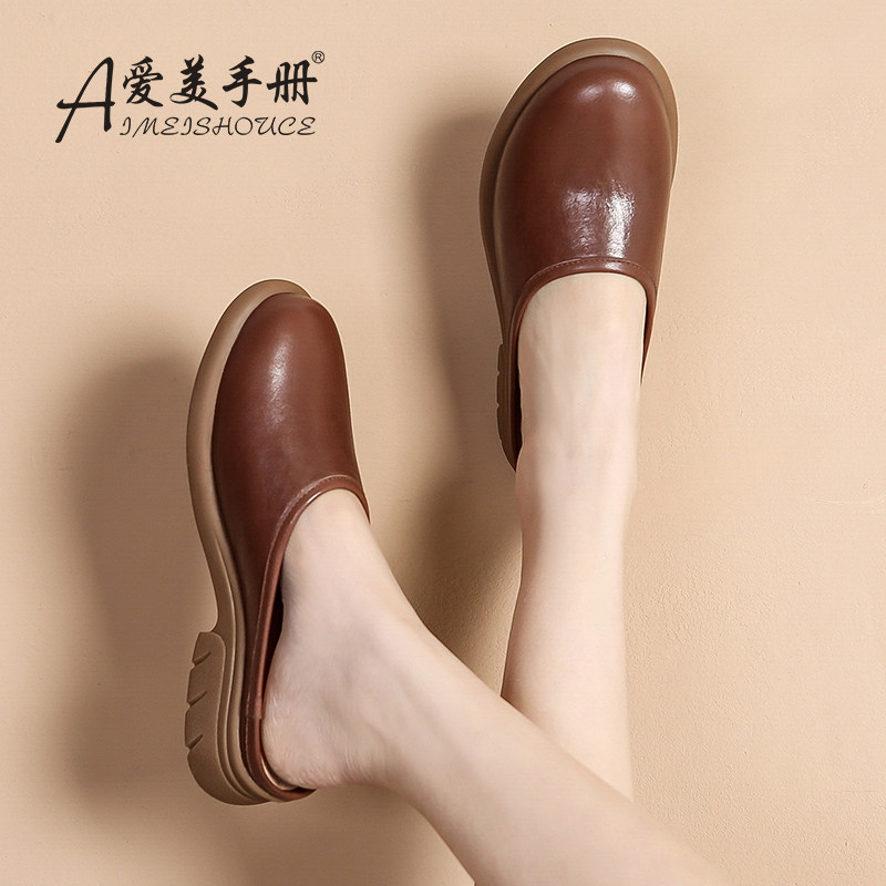 2025春夏季新款外穿拖鞋女复古真皮包头半拖鞋女凉鞋平底大码女鞋