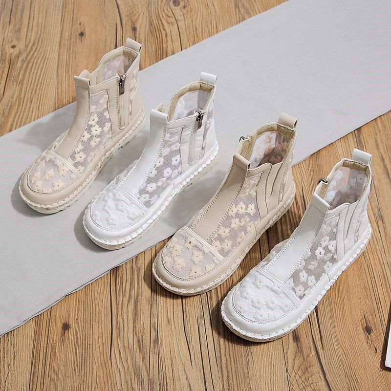 网纱短靴女凉靴夏季绣花仙女凉鞋平底网靴春秋薄款透气镂空马丁靴