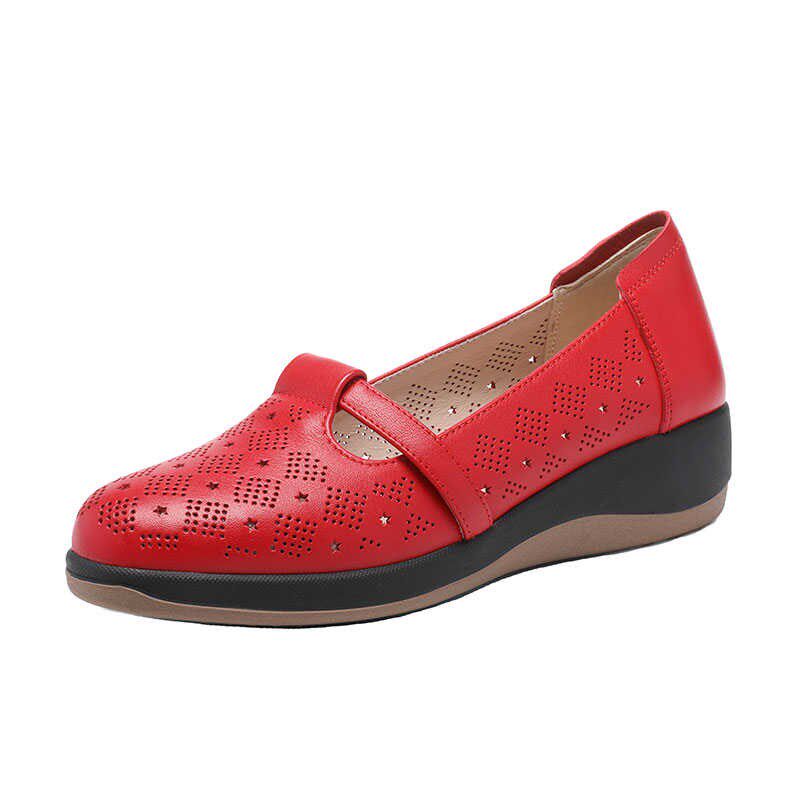 夏季单鞋妈妈鞋中老年女凉鞋平底软底舒适老人镂空坡跟红色真皮鞋