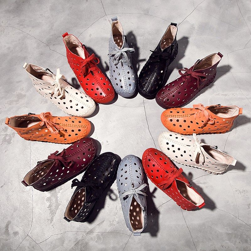 真皮镂空夏短靴包头包跟女凉鞋平底洞洞鞋头层牛皮软底休闲女凉靴