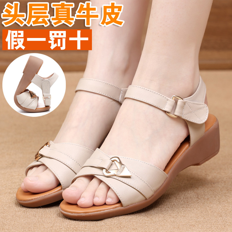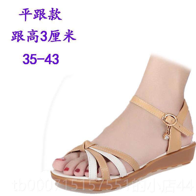 正品2025软夏季新款楔型女凉鞋平底妈妈皮鞋子罗码大尺中跟底中年