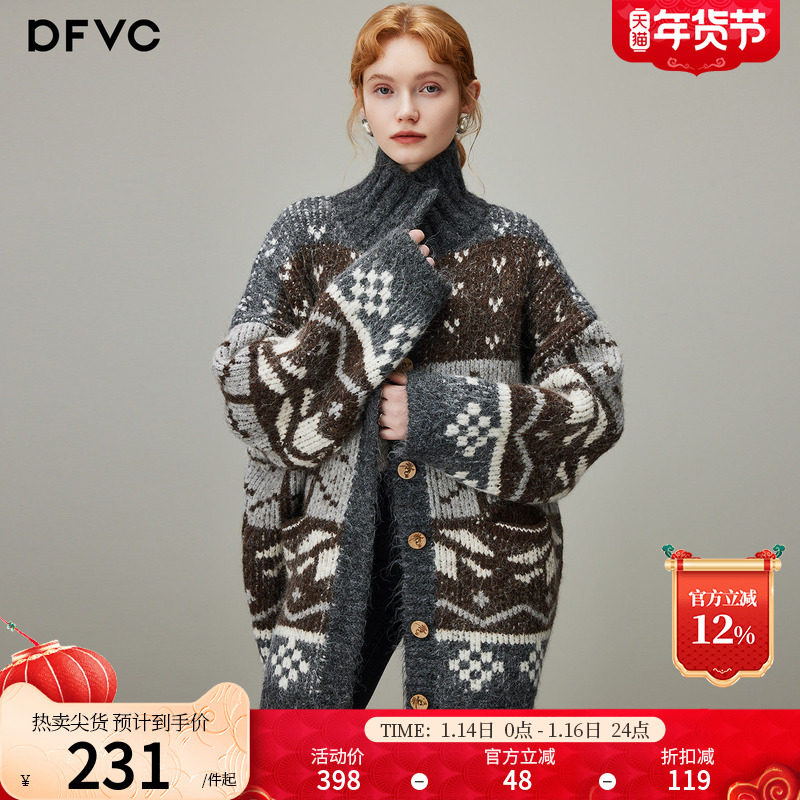 dfvc复古费尔岛提花针织开衫女2025年冬季新款宽松中长款毛衣外套