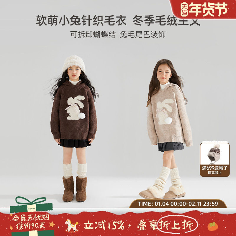 女童美拉德风连帽毛衣中大童针织衫中长款圈圈纱毛衣裙休闲外套潮
