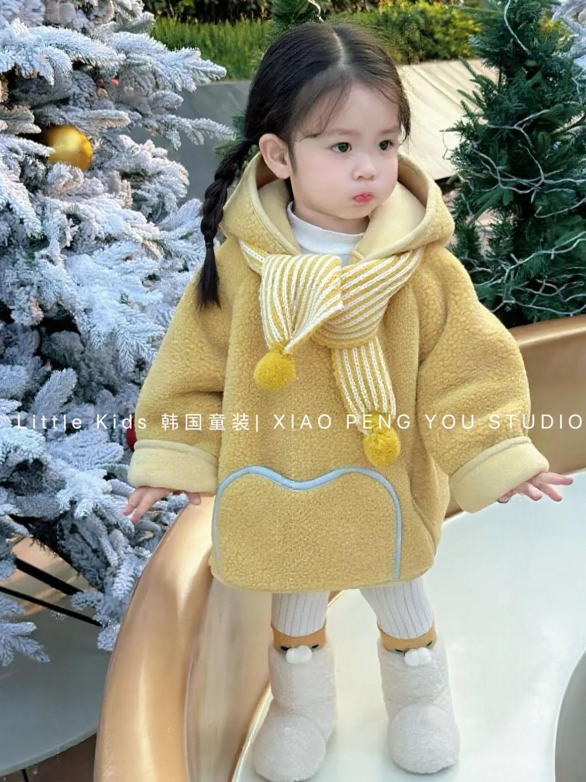 儿童星星加绒外套冬装2025男女童加厚精灵帽毛毛衣保暖中长款大衣