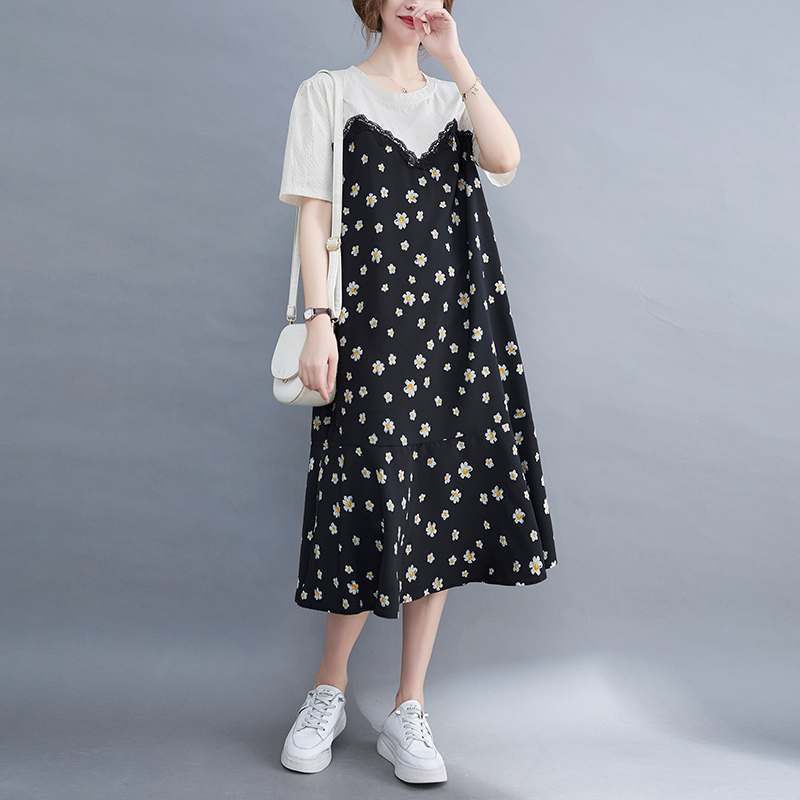 大码假两件雪纺连衣裙女夏季胖妹妹碎花拼接显瘦荷叶边鱼尾裙子潮