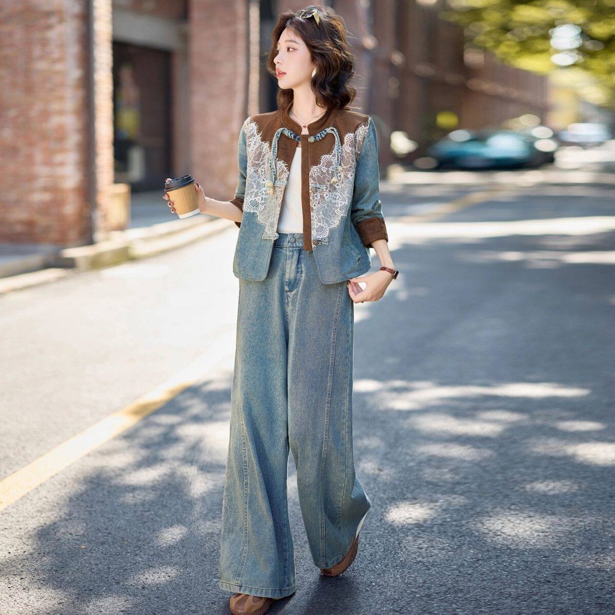 新中式设计感蕾丝拼接盘扣牛仔套装女2025春秋新款洋气气质两件套