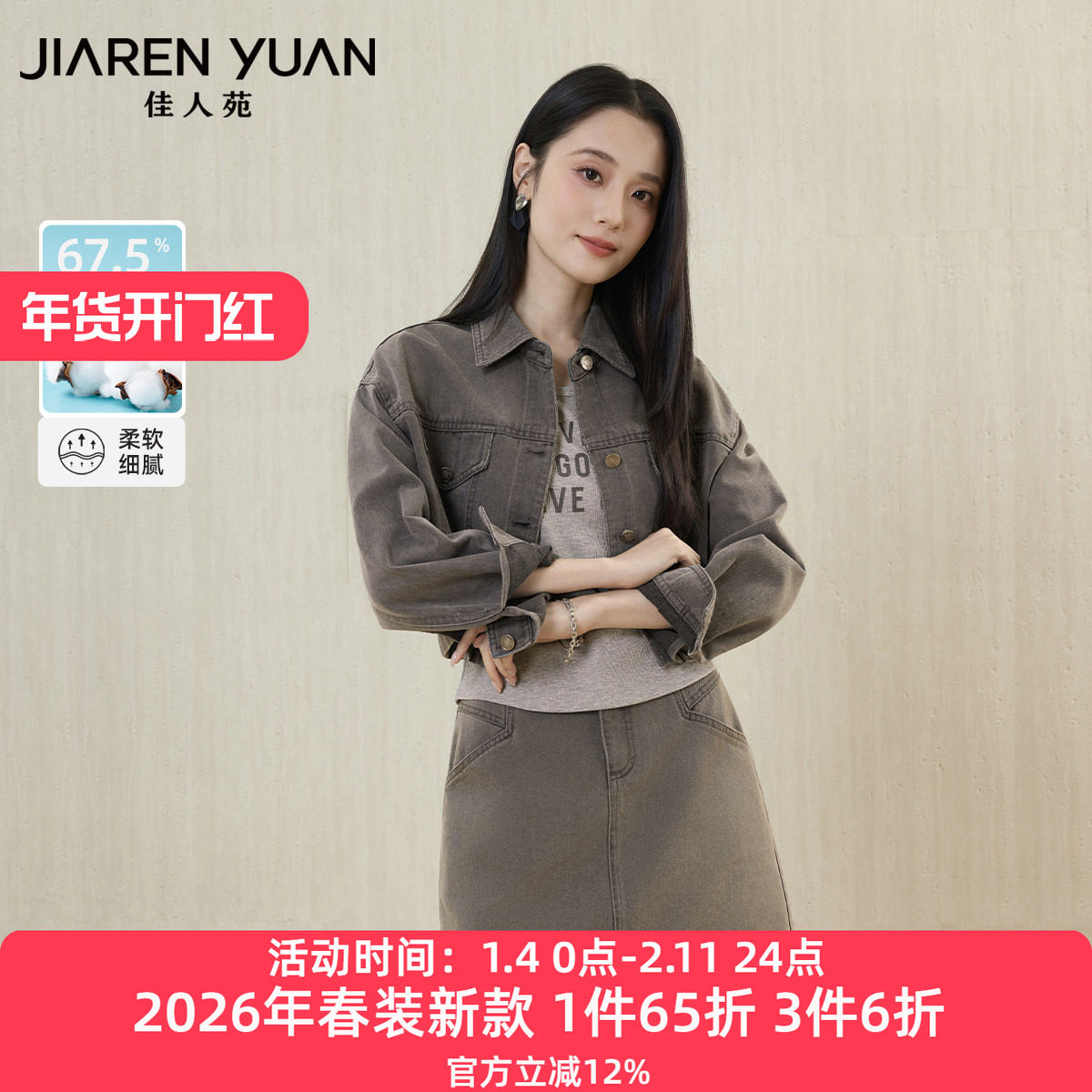 佳人苑套装女2026年春季新款翻领金属排扣两件套牛仔外套都市摩登