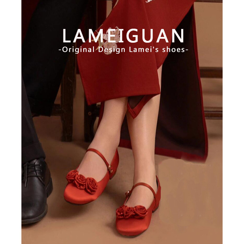 红色法式玫瑰扣带玛丽珍平底鞋女2026春季新款秀禾新娘鞋浅口婚鞋