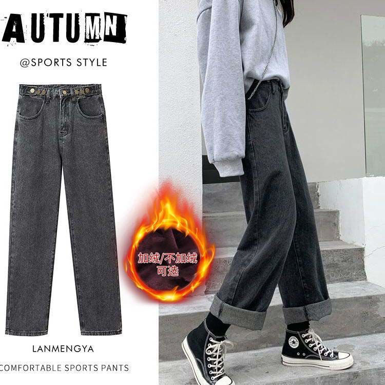 秋冬季加绒新款高腰牛仔裤女宽松韩版学生阔腿直筒显瘦加厚裤子女