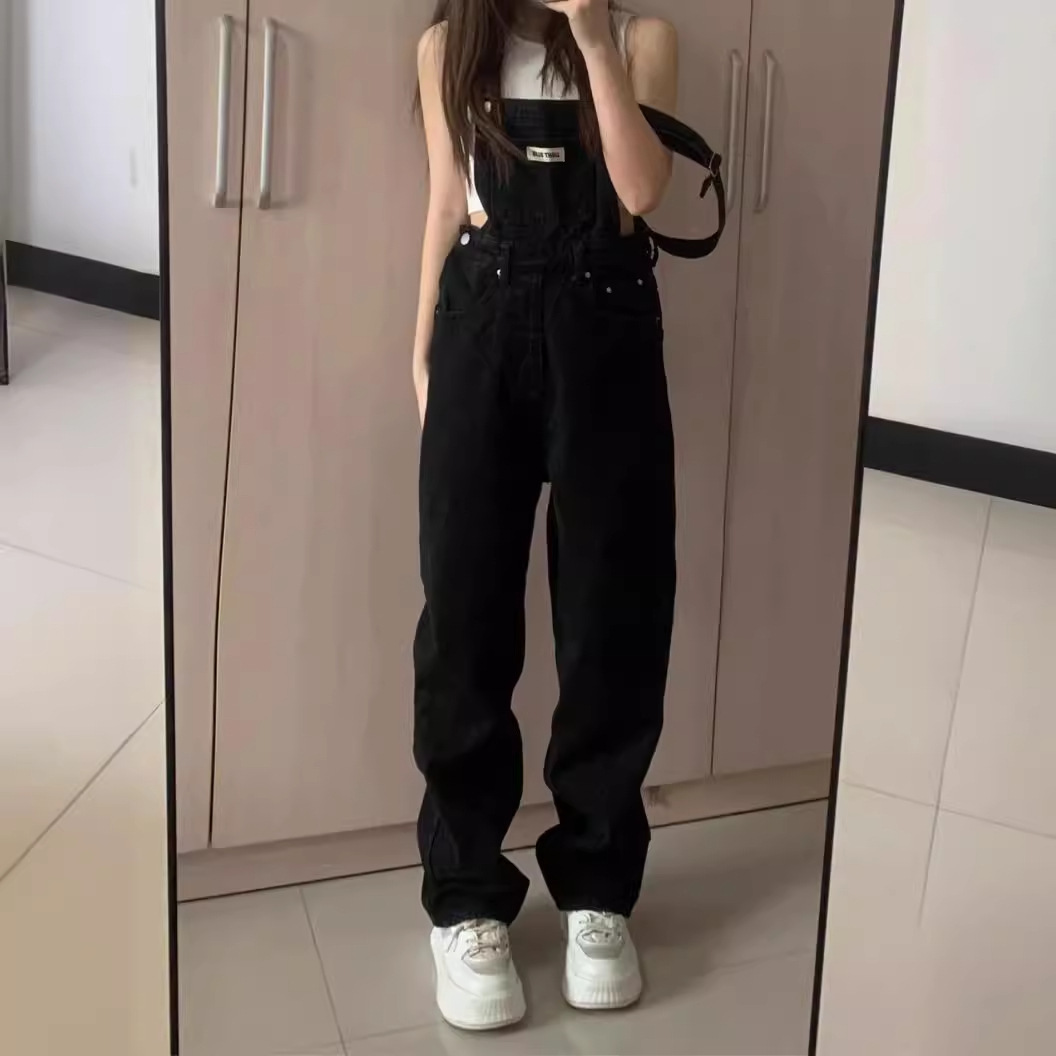 复古黑色牛仔背带裤女韩版宽松学生减龄小个子高腰直筒阔腿连体裤