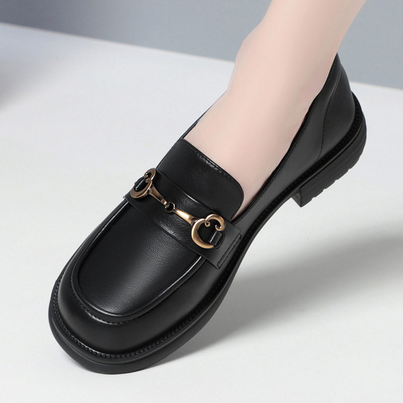 2025年春季新款真皮折扣圆头深口套脚低跟粗跟乐福鞋英伦风女单鞋