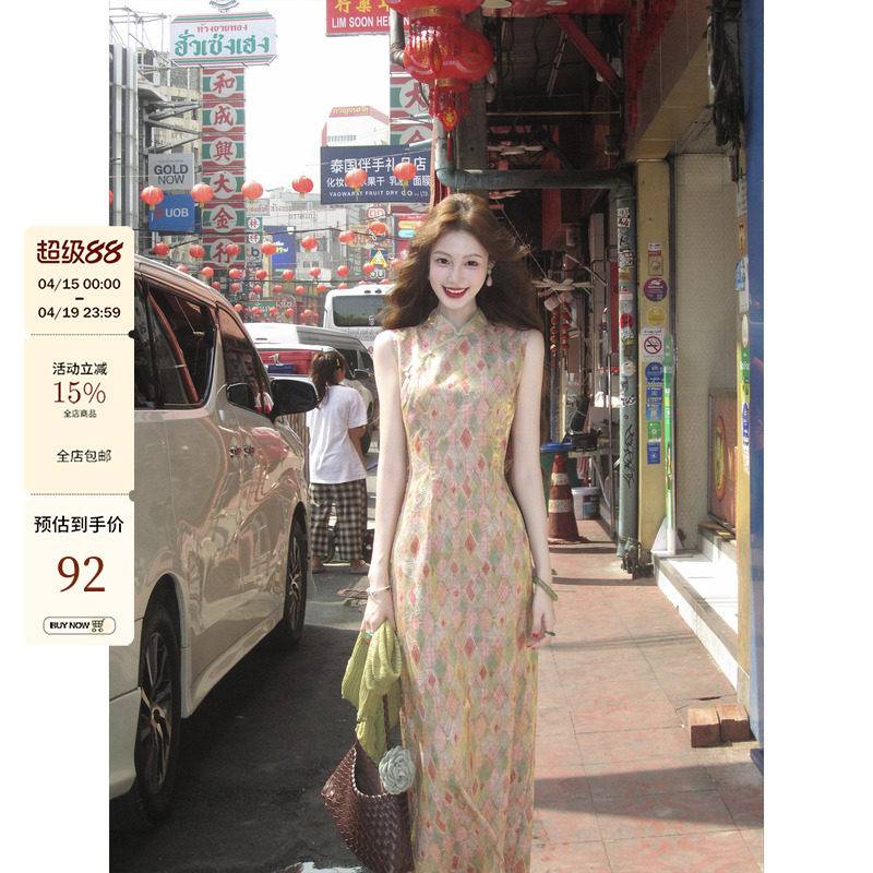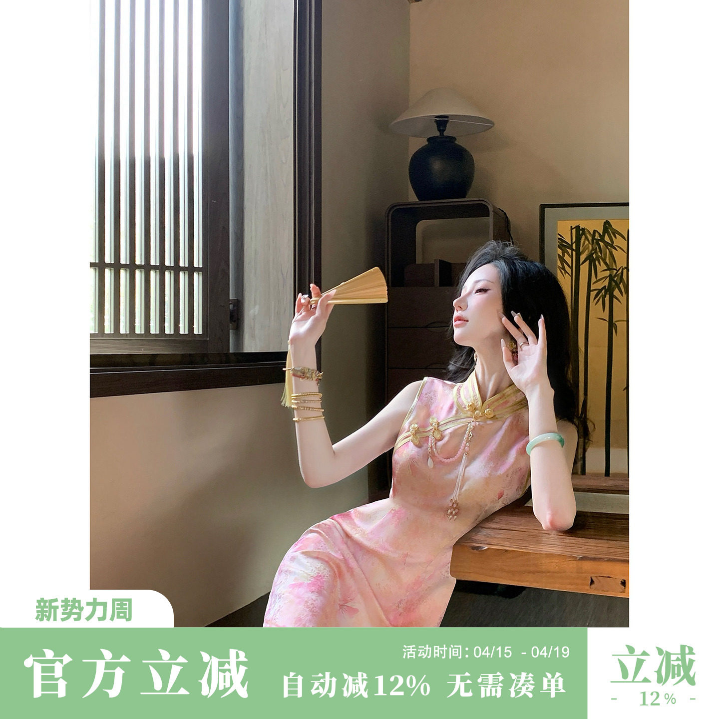 Sun雅乔【暗香盈袖】夏无袖连衣裙粉金晕染新中式人丝提花旗袍裙