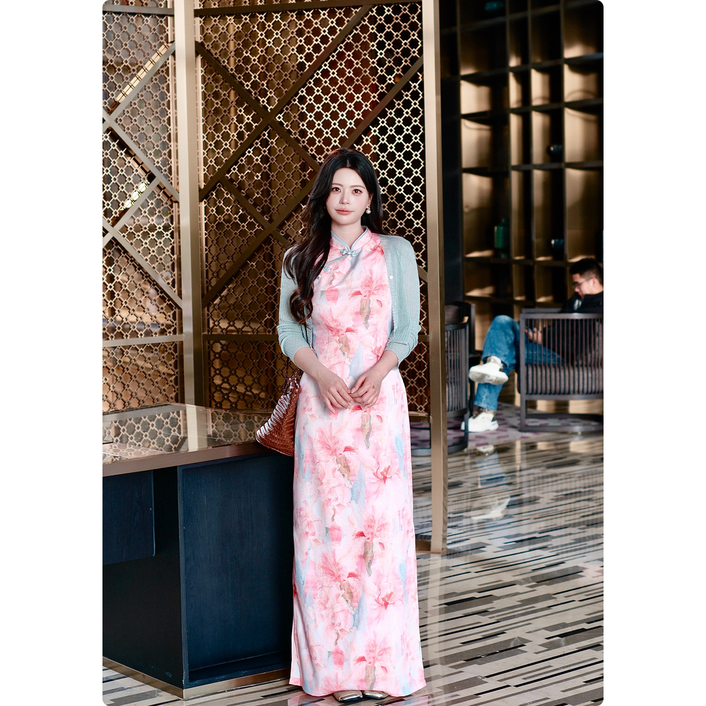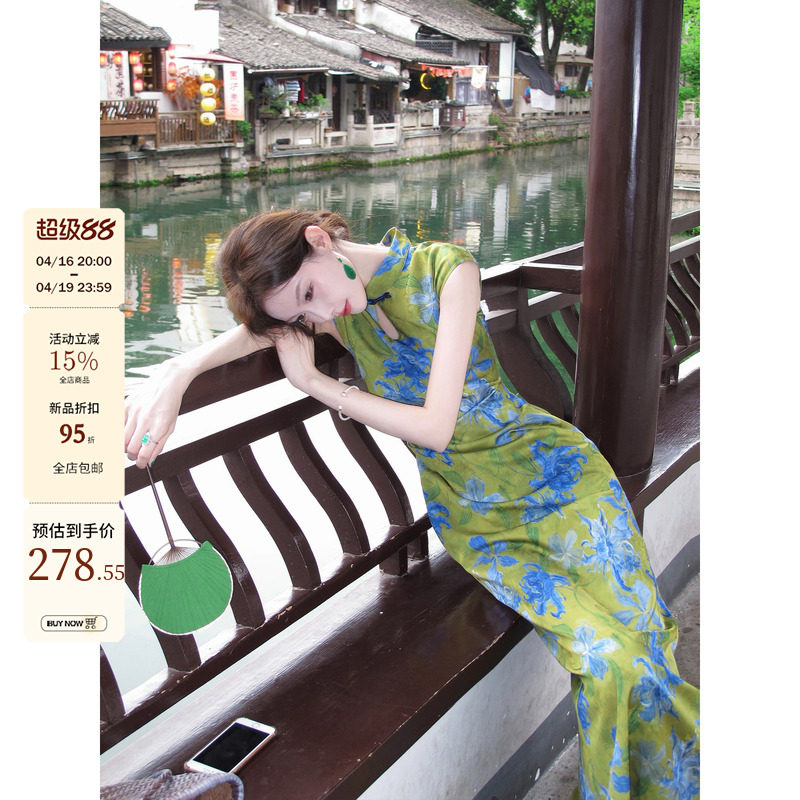 吃绿色菜【锦绣】复古新中式原创定制印花提花长款旗袍连衣裙女夏