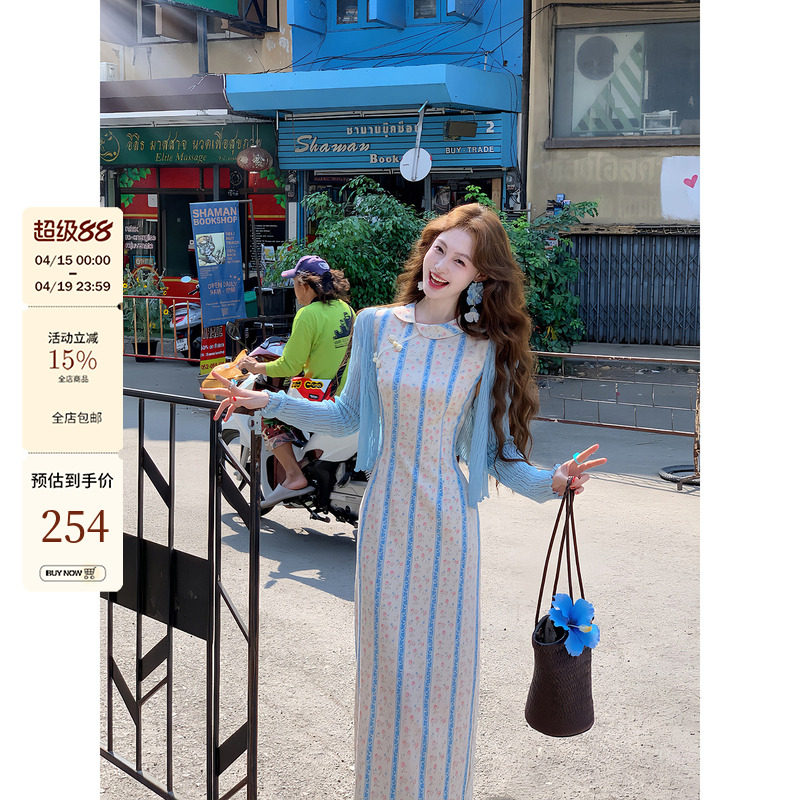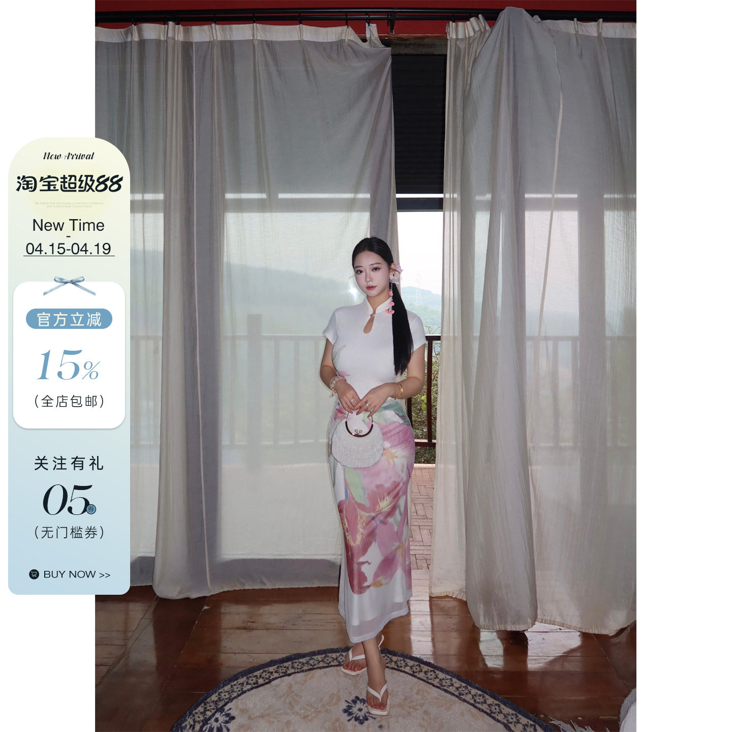 肉装小cherry 繁花私语 小立领微胖正肩抽皱包臀直筒旗袍连衣裙