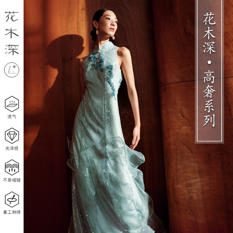花木深新中式晚礼服女手工珠绣国风连衣裙晚宴高奢立领旗袍裙定制