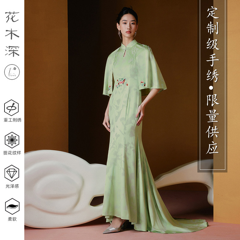 花木深手工苏绣晚礼服立领中式敬酒服桑蚕丝高奢披肩式旗袍裙定制