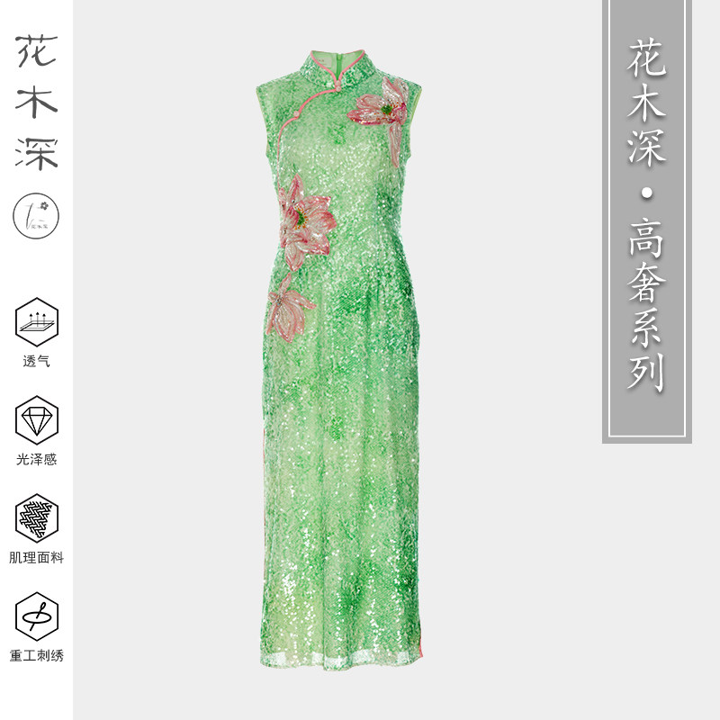 花木深中式刺绣晚礼服手工珠绣立领无袖旗袍荷叶边高奢连衣裙定制