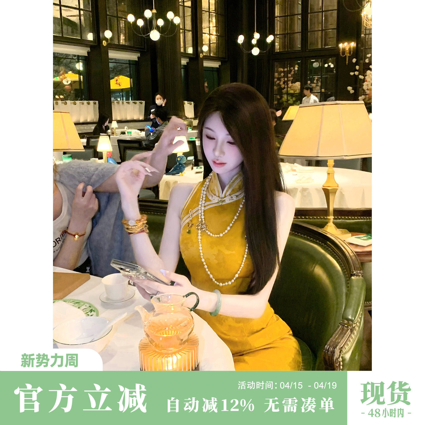 Sun雅乔【盛世太平】早春金色暗纹提花新中式国风无袖旗袍连衣裙