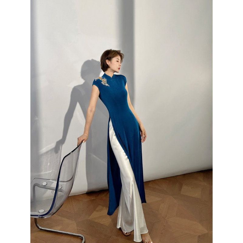 XULU原创进口醋酸订制蓝色月亮袖重工订珠高开叉旗袍高腰直腿长裤