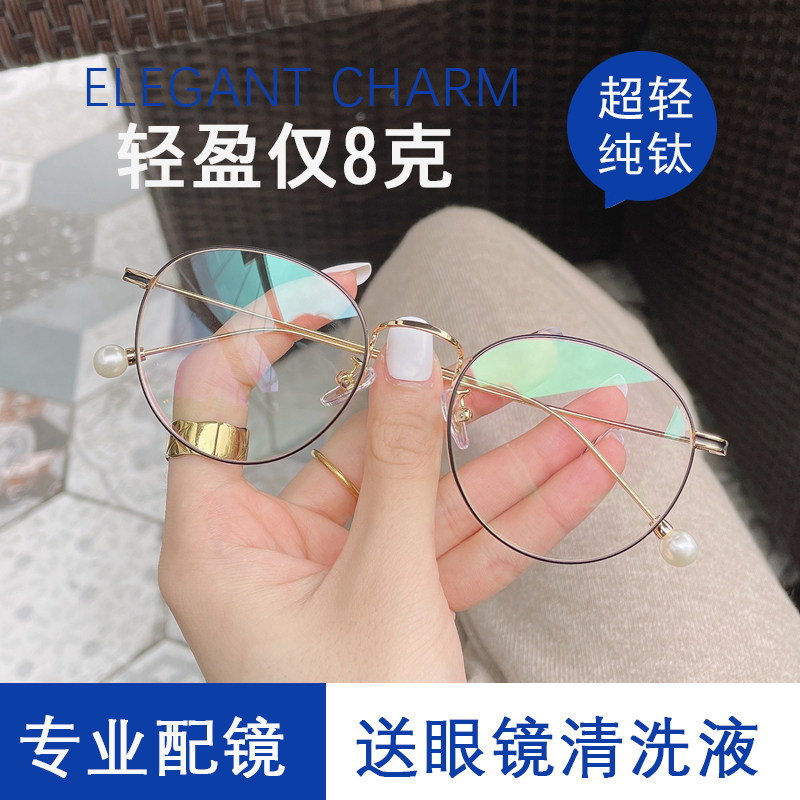 超轻纯钛眼镜框女韩版潮复古珍珠圆脸防蓝光近视镜女平光镜有度数