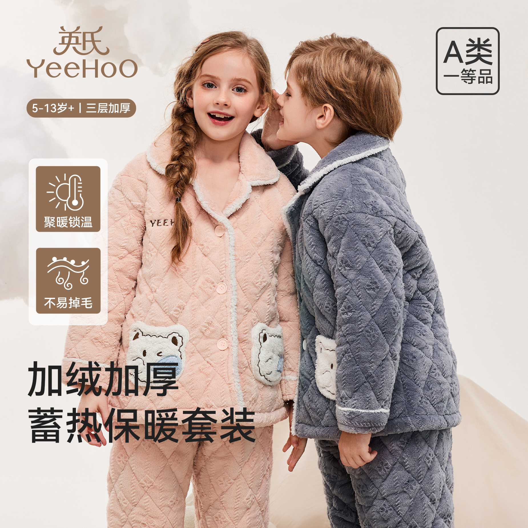 英氏儿童睡衣冬季加绒加厚男童女童宝宝家居服套装2025年三层夹棉
