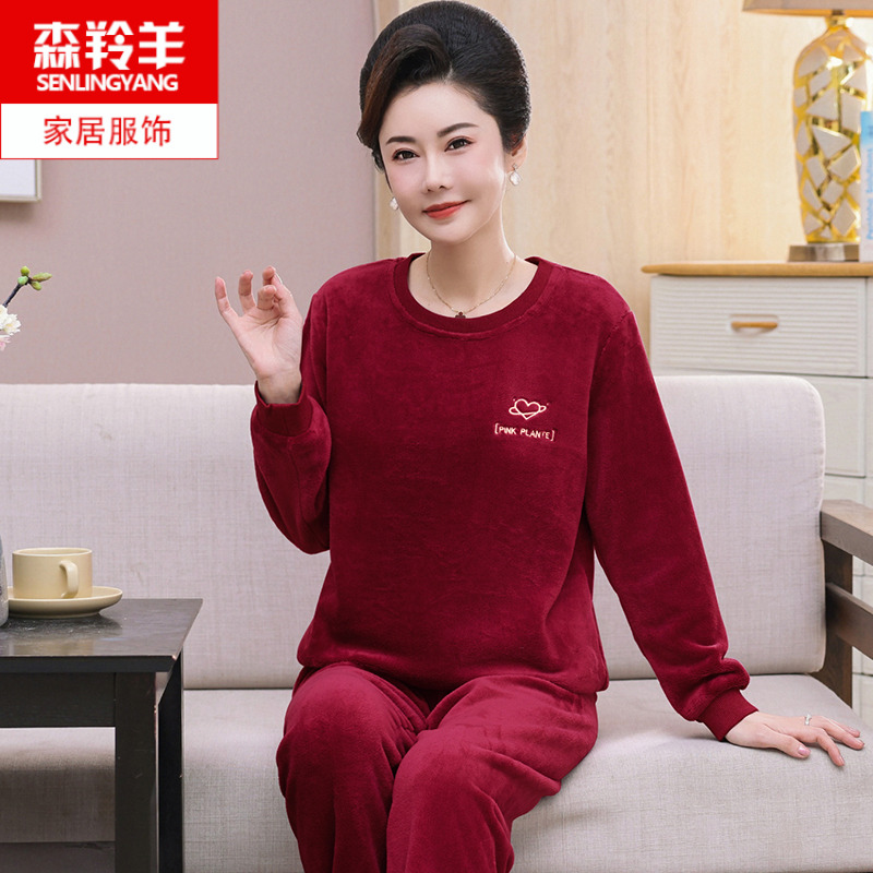 女士珊瑚绒睡衣冬季加绒加厚保暖长袖套头休闲中年妈妈家居服套装