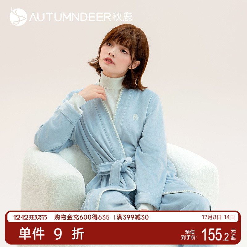 秋鹿纯棉海岛绒女士睡衣冬季加绒加厚睡袍家居服秋冬季长袍中长款