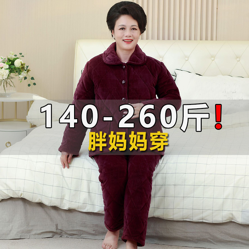 中老年妈妈睡衣冬季加绒加厚大码200斤三层夹棉珊瑚绒保家居服女
