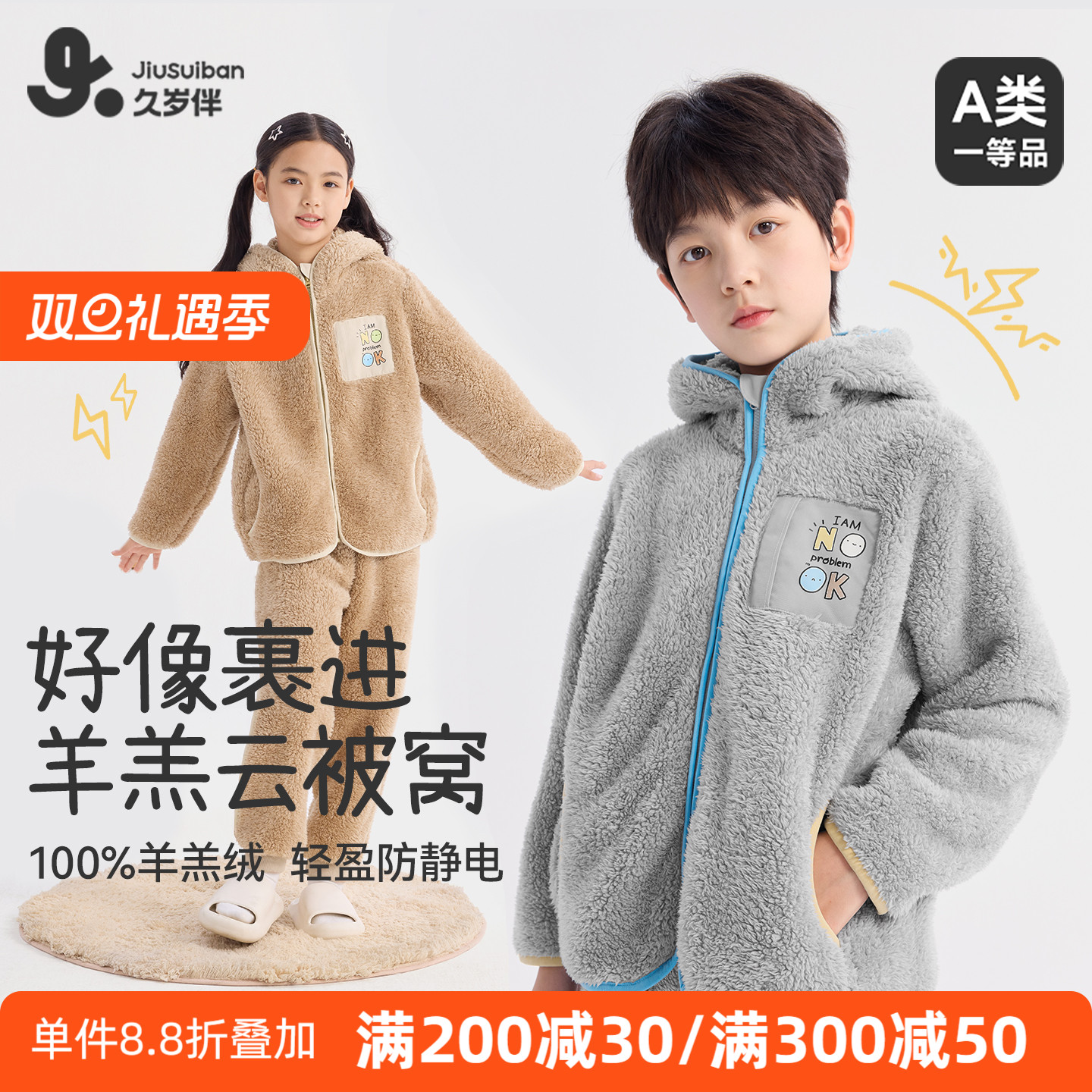 久岁伴男童睡衣冬季加绒加厚2025新款女童羊羔绒家居服套装连帽冬