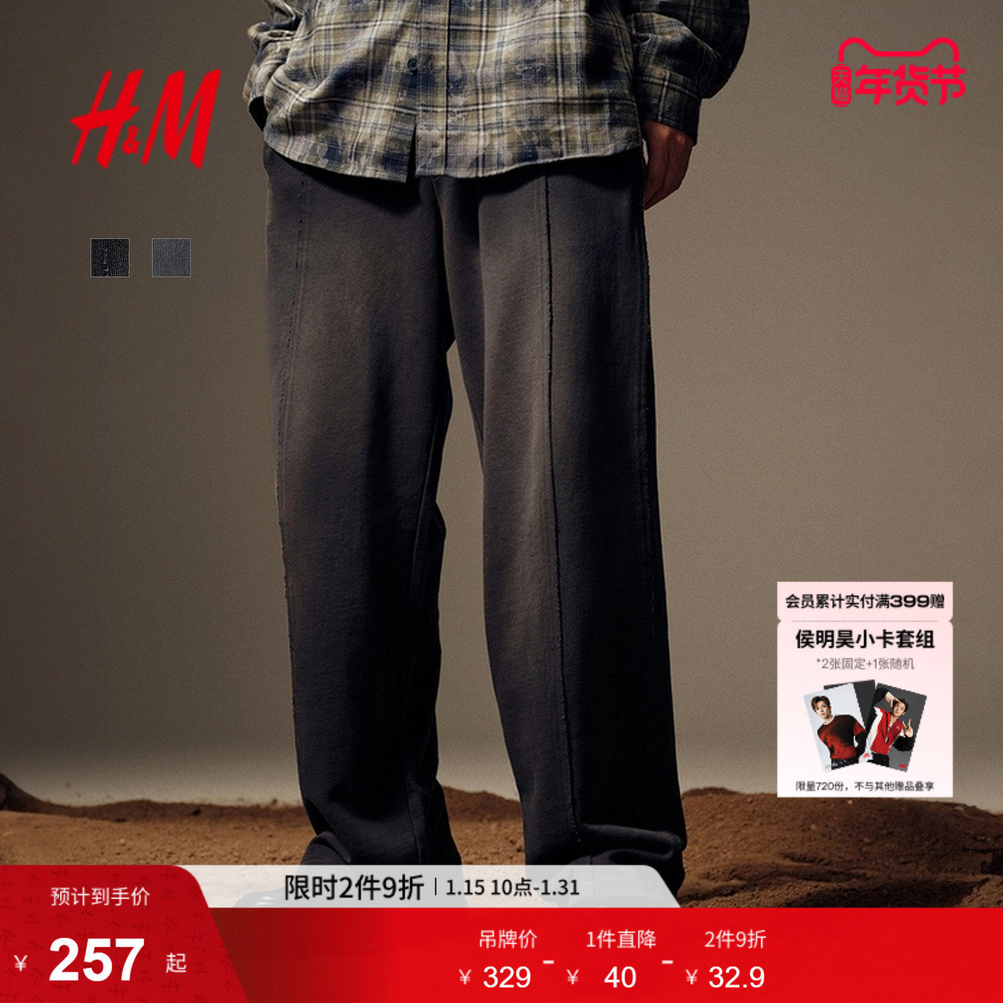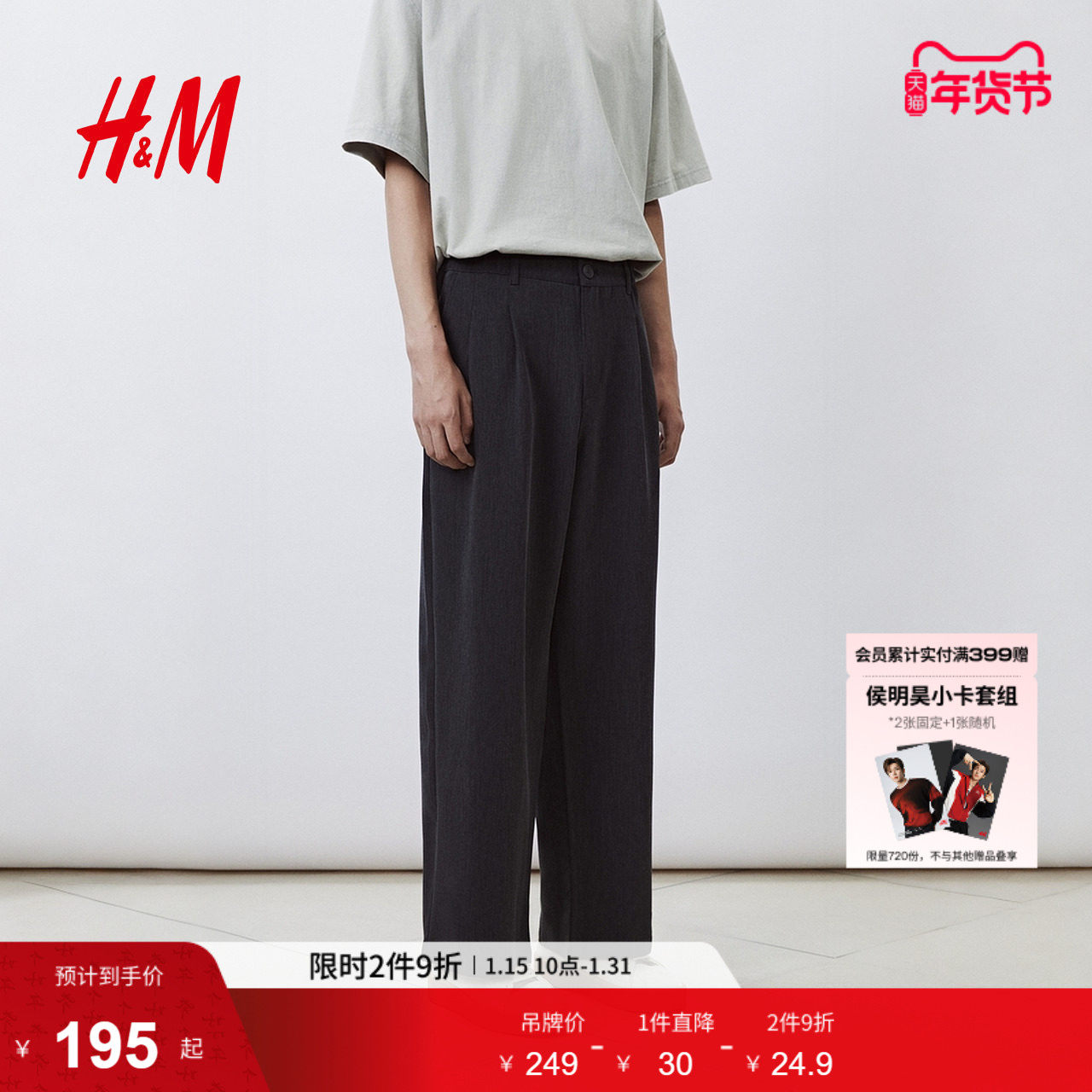 HM男装西裤冬季宽松柔软梭织直筒阔腿带烫折长裤1258152