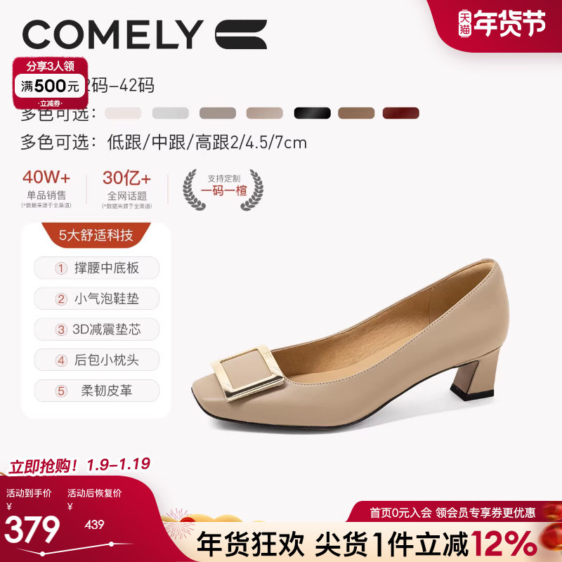 康莉comely牛漆皮细跟方头单鞋女秋新款通勤经典方扣高跟鞋