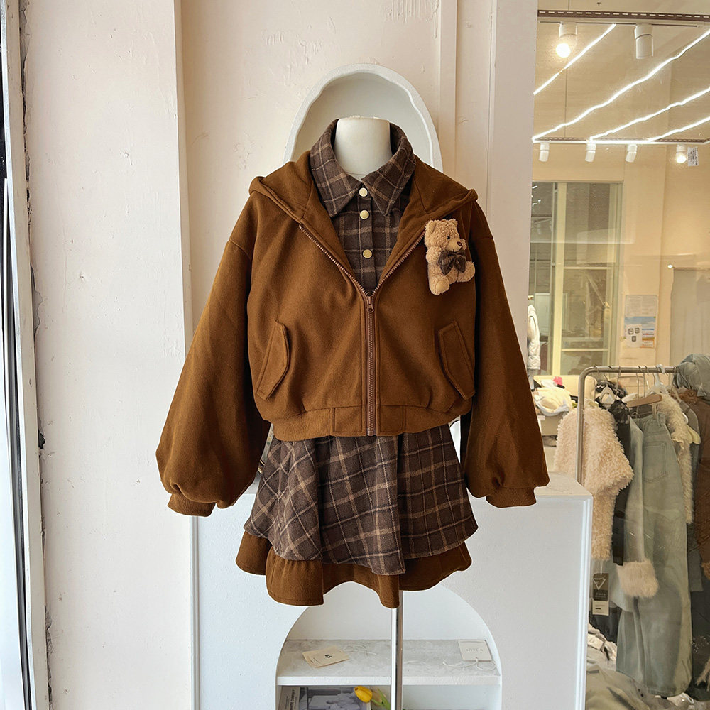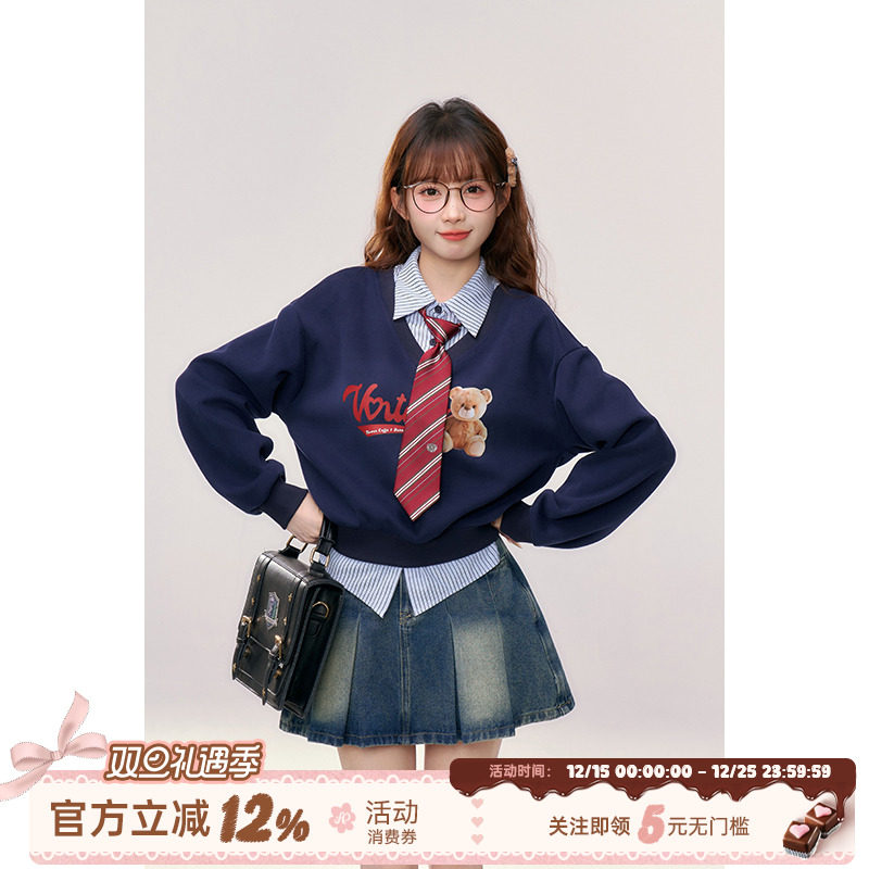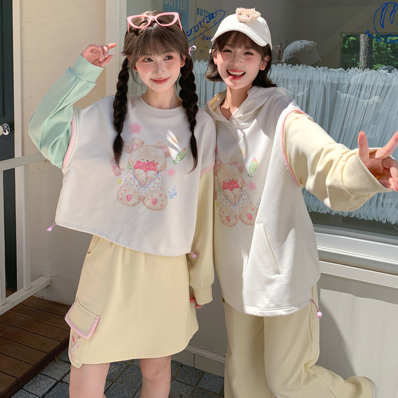 织物猪 栗子小熊 复古学院风假两件连帽卫衣女秋冬长袖短外套套装