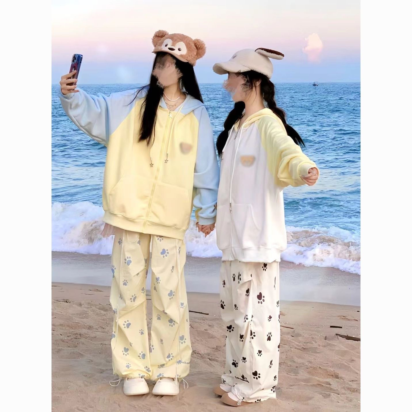盐系学院风套装美式设计感小熊插肩连帽卫衣外套狗爪阔腿裤两件套
