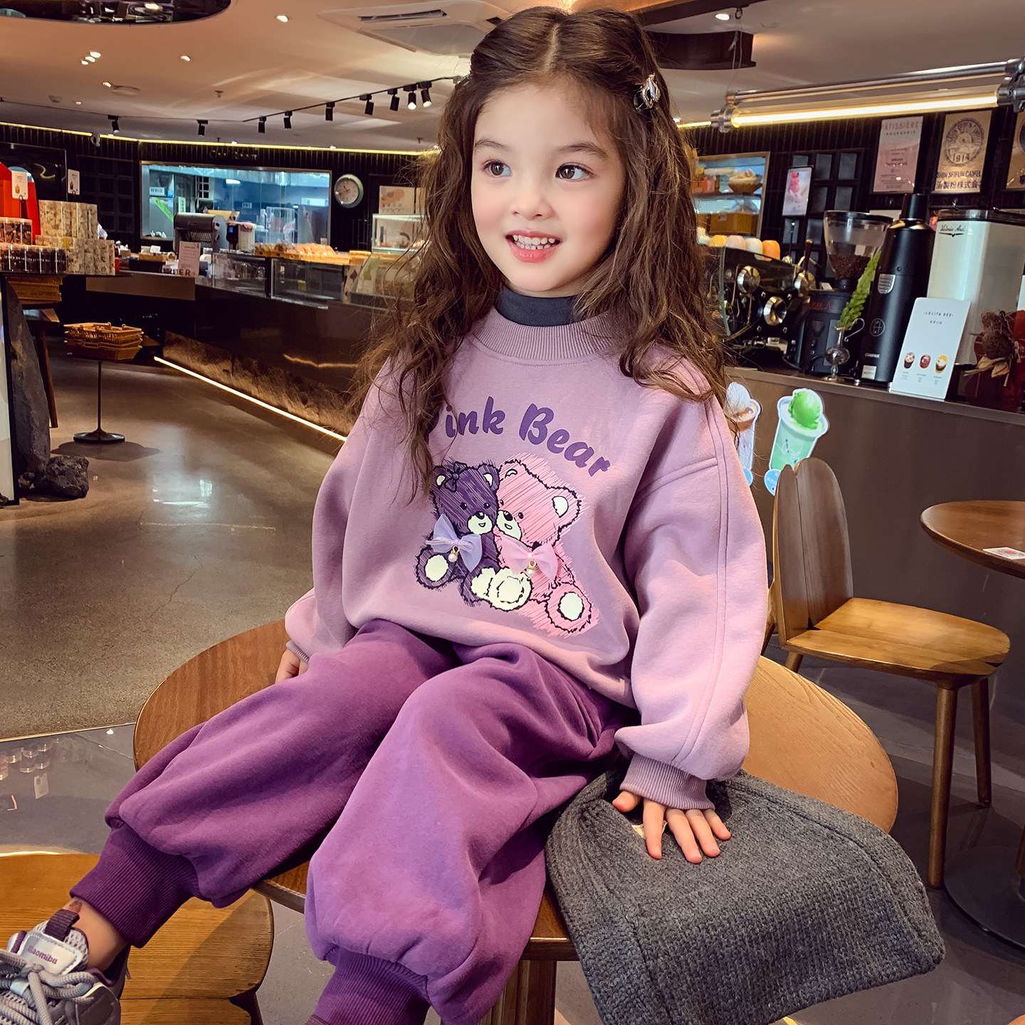 女童加绒套装冬装2025新款儿童卡通小熊运动卫衣休闲裤两件套女孩