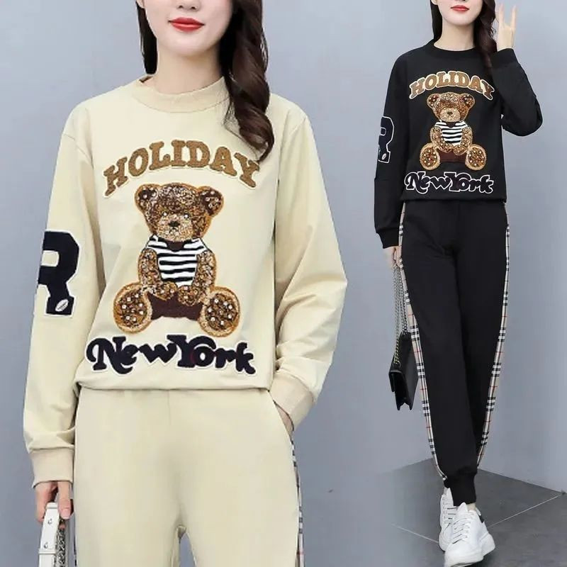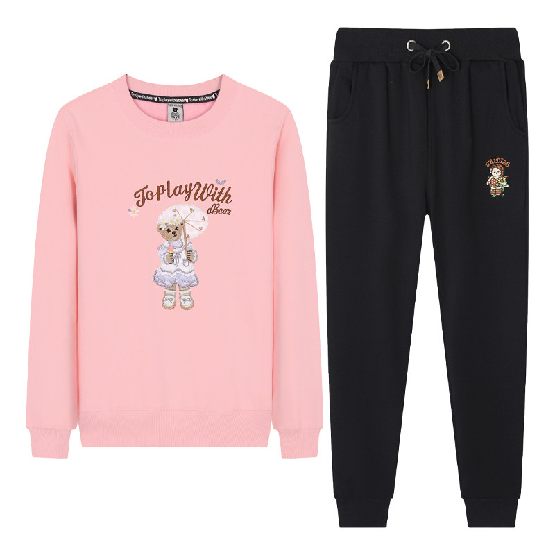 小熊卫衣女休闲套装秋冬圆领绣花薄款两件套加绒宽松大码运动服潮