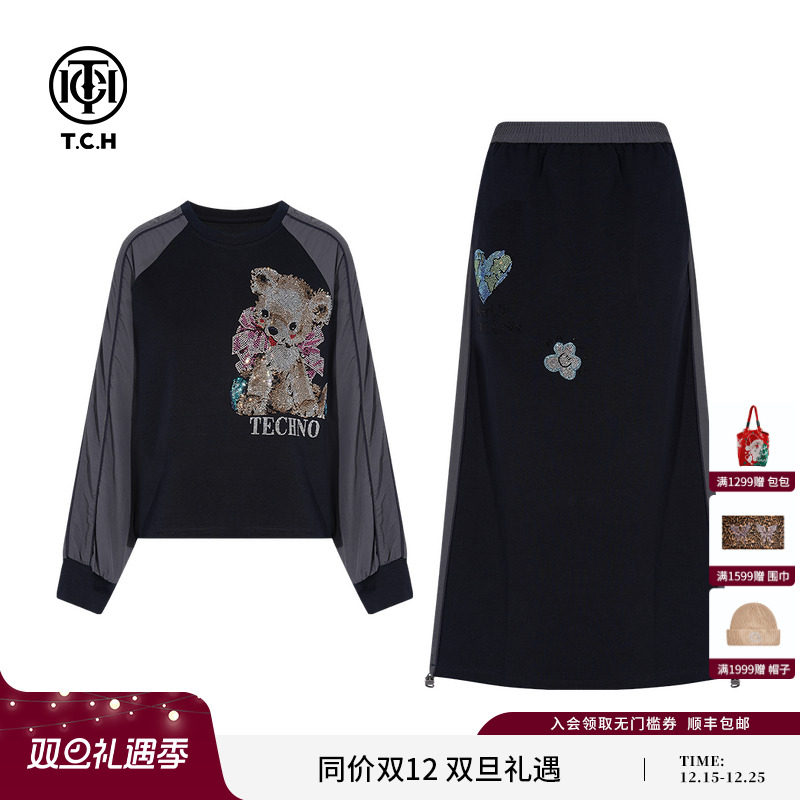 TCH轻奢时尚潮牌小熊爱心烫钻撞色时尚卫衣半身裙套装T75C07E1022