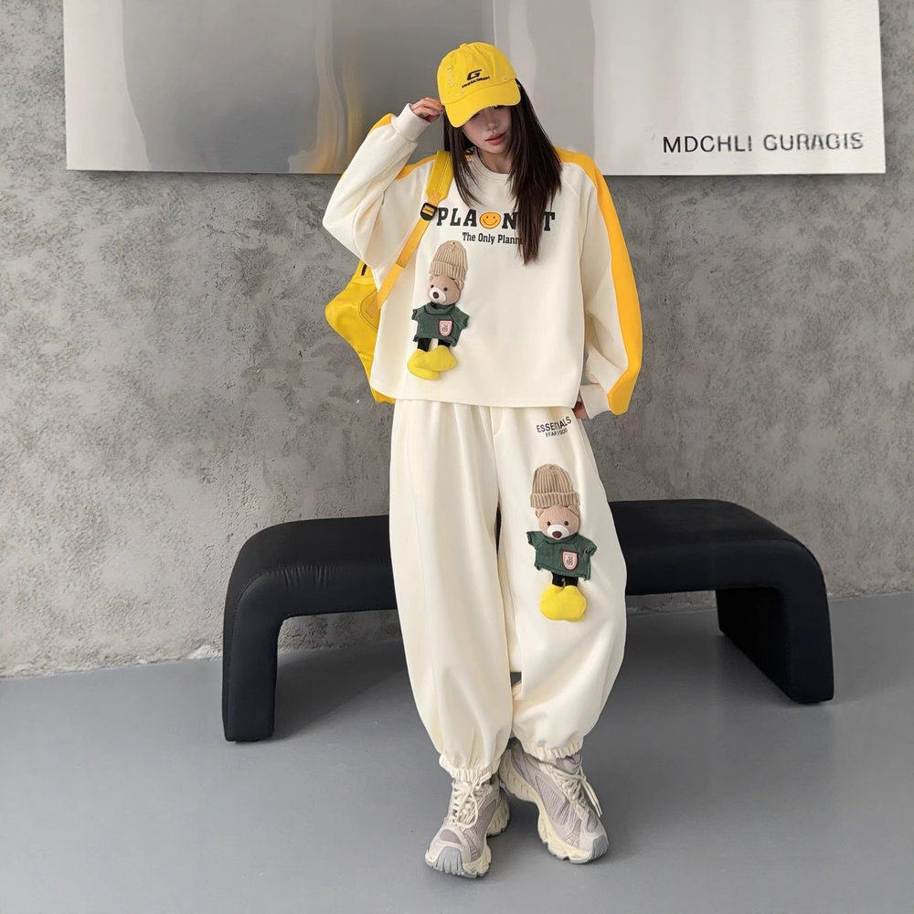 韩系ins~小众撞色字母印花宽松休闲卫衣+小熊头休闲长裤套装秋冬