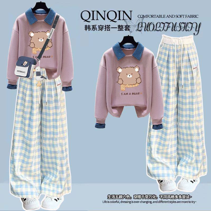 套装拼接卡通小熊卫衣束脚卫裤女2026春新款洋气减龄学院风两件套