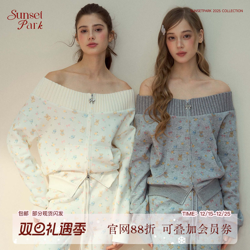 SunsetPark日落公园 "熊兔日记本"碎花小熊兔印花一字肩卫衣套装