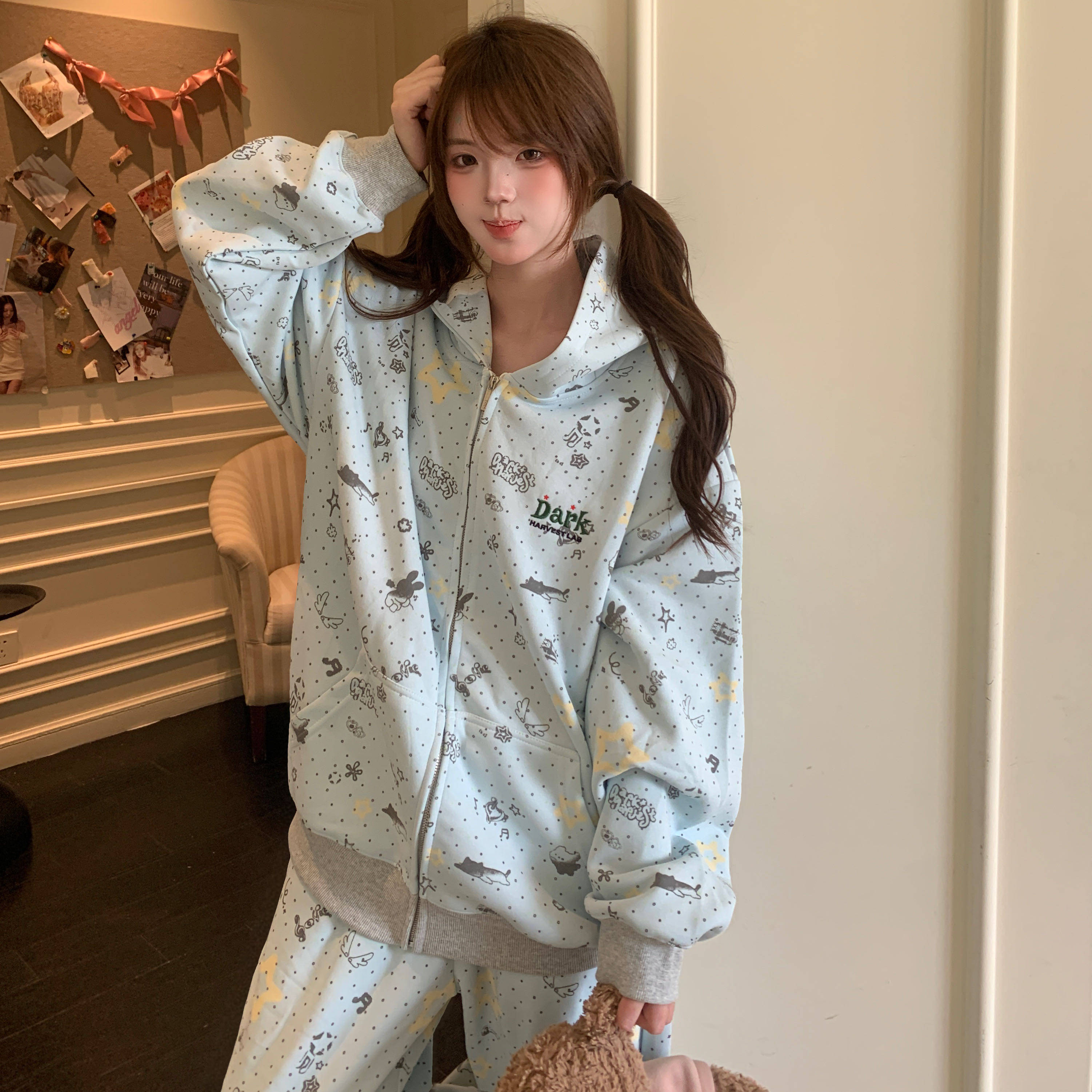 Amoeba可爱甜美满印星星小熊耳朵连帽卫衣外套阔腿卫裤撞色套装