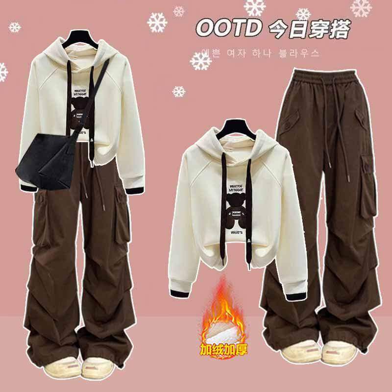 欧货重工小熊卫衣加绒套装女冬休闲时尚微胖减龄气质运动服小个子
