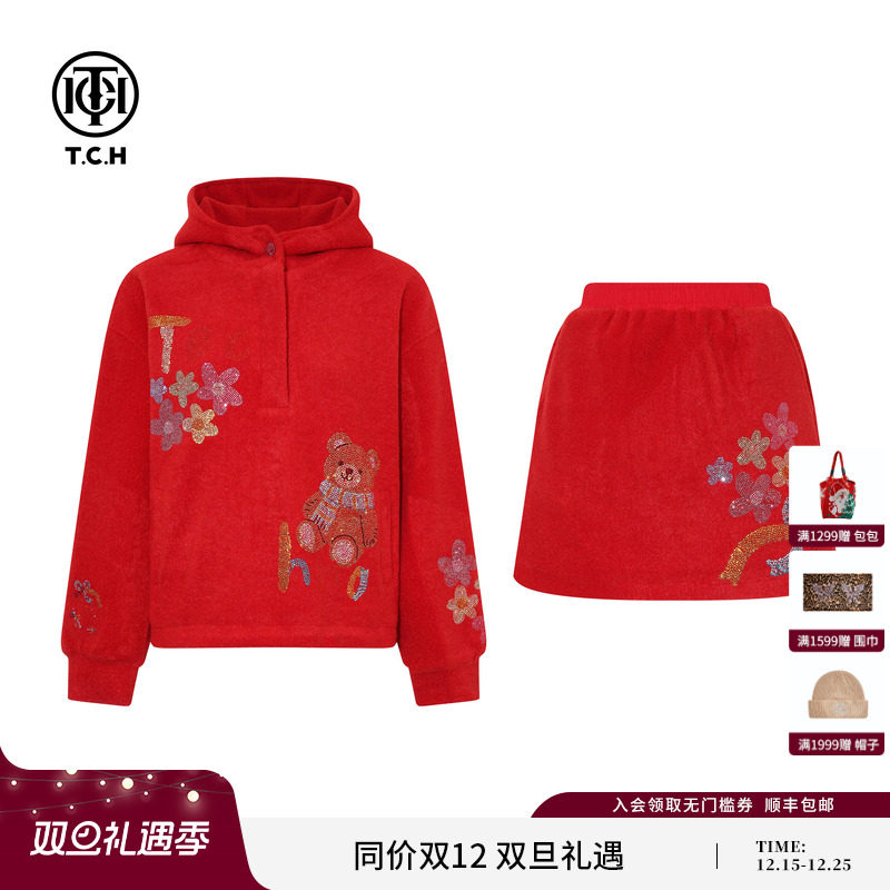 TCH烫钻小熊时尚秋冬保暖连帽卫衣女红色半身裙套装T75D07E1090