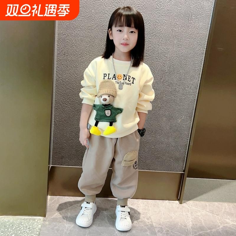 女童立体小熊卫衣套装春秋2024新款时髦秋冬装儿童加绒长袖两件套