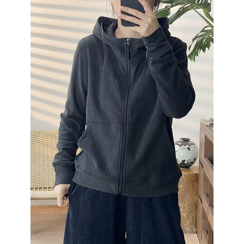 软糯舒适设计感拇指扣连帽拉链卫衣女宽松洋气深灰色开衫外套秋冬