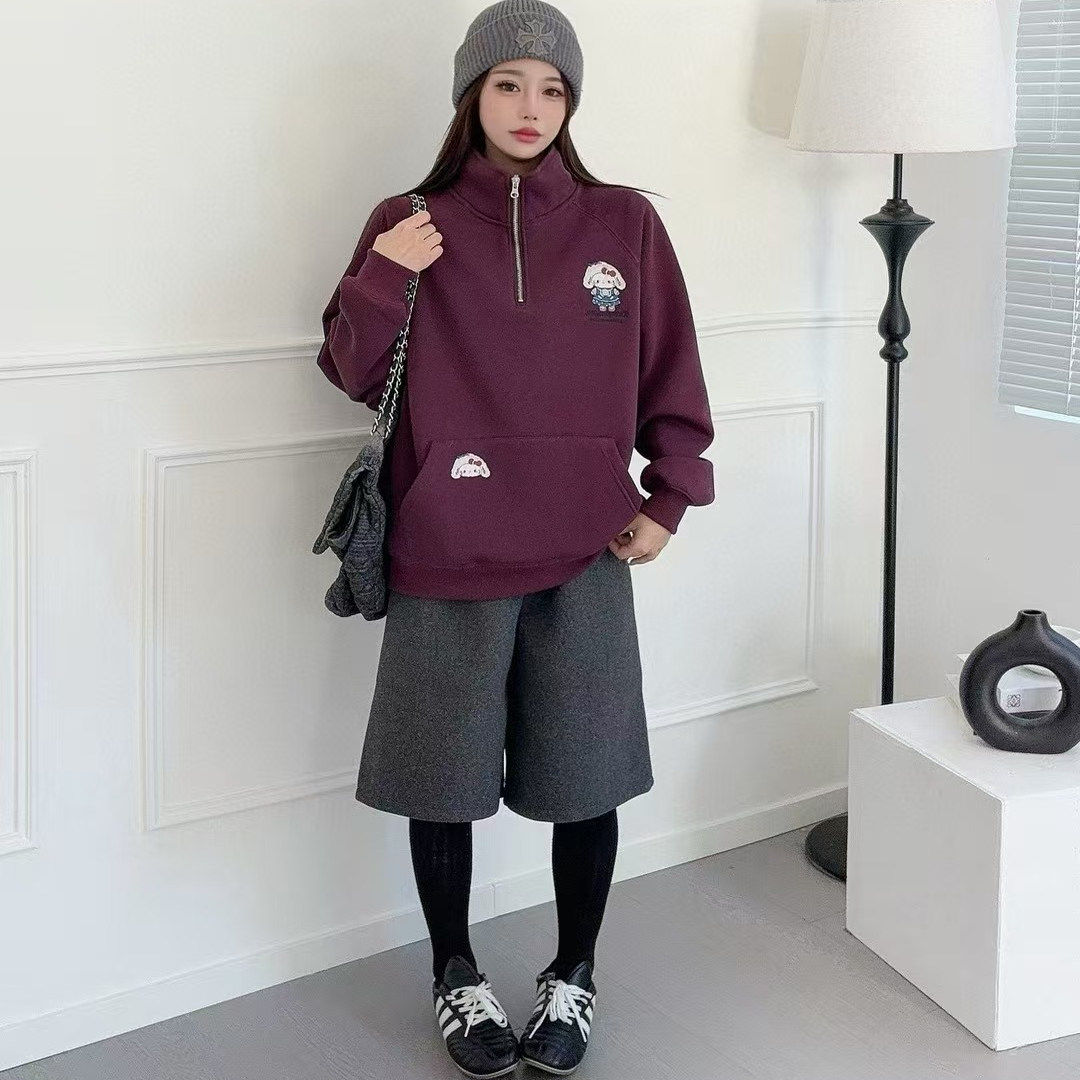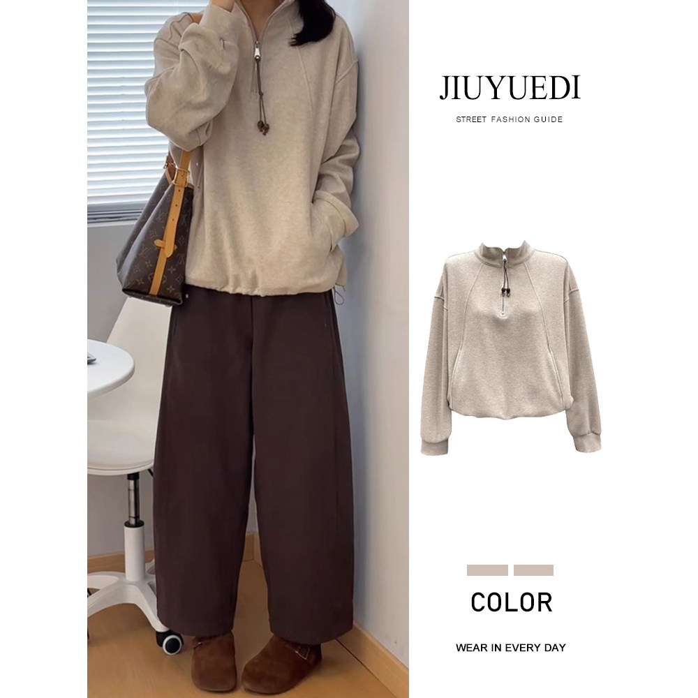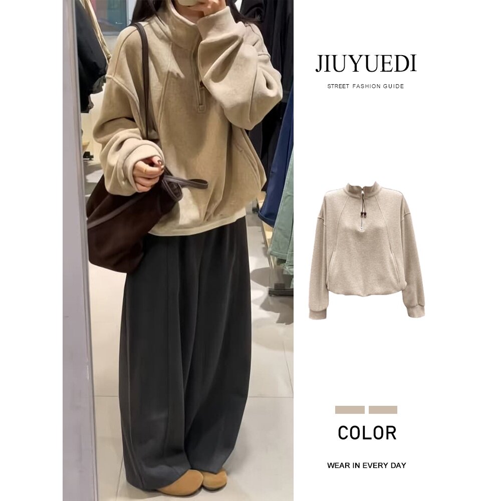 JIUYUEDI九月底韩系燕麦色立领半拉链卫衣女宽松慵懒高级感上衣