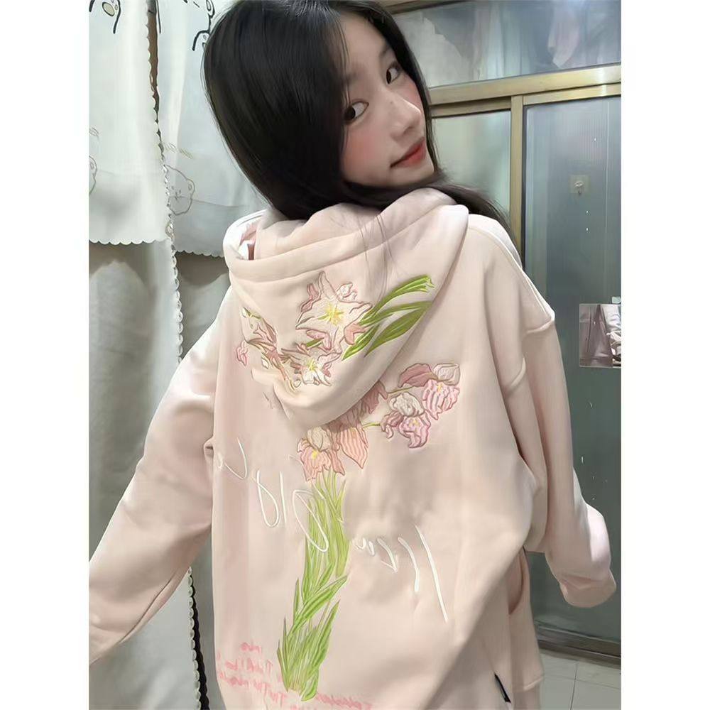 IMCC设计感小众纯色刺绣字母连帽拉链卫衣女宽松百搭帽衫上衣外套