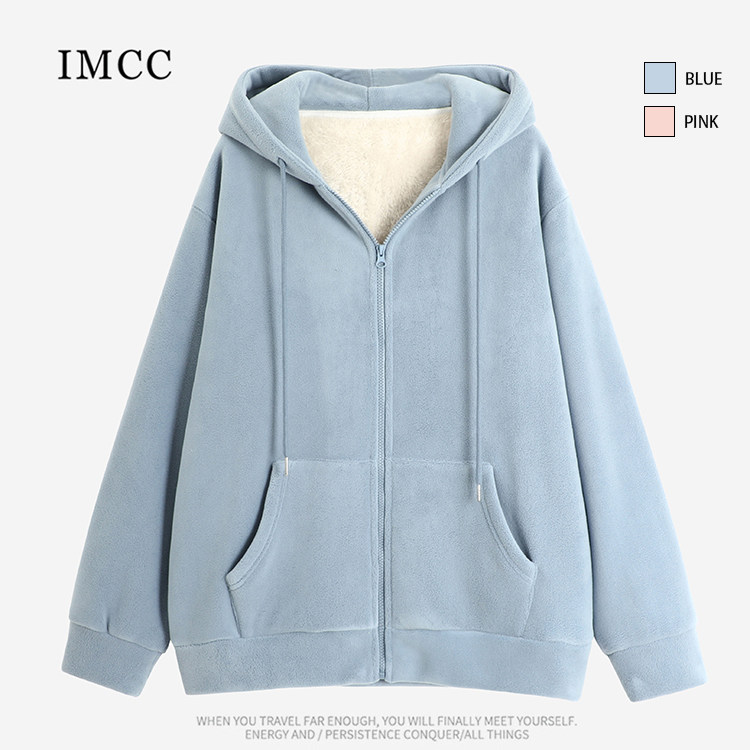 IMCC设计感小众纯色奥利baby绒羊羔毛拉链卫衣女宽松保暖外套棉服