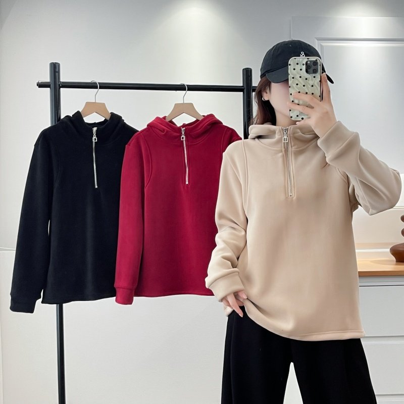大码冬季新款双面绒连帽半拉链卫衣女宽松显瘦休闲打底上衣拉链衫