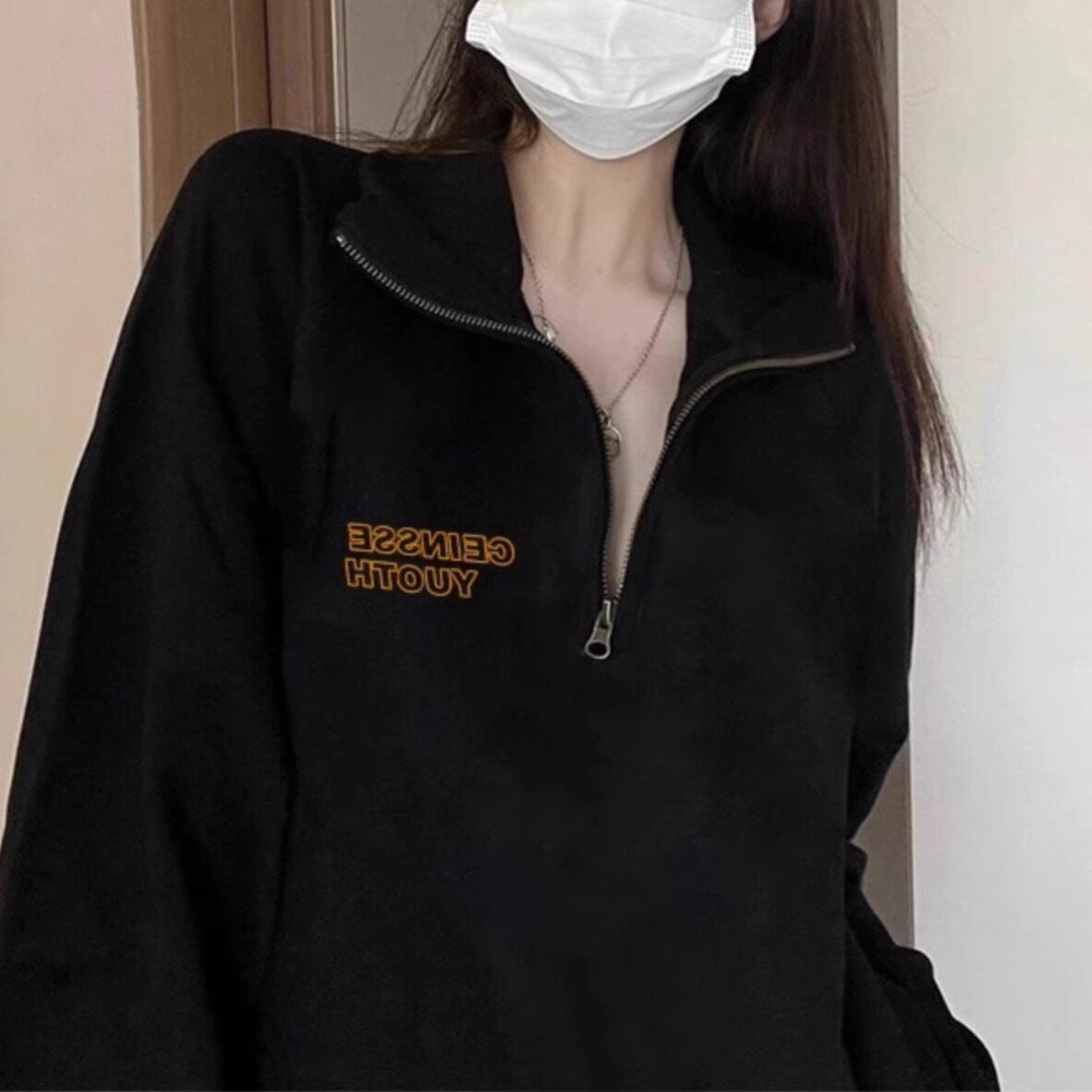 松弛风polo衫黑色半拉链卫衣女宽松设计感美式潮牌百搭休闲上衣女